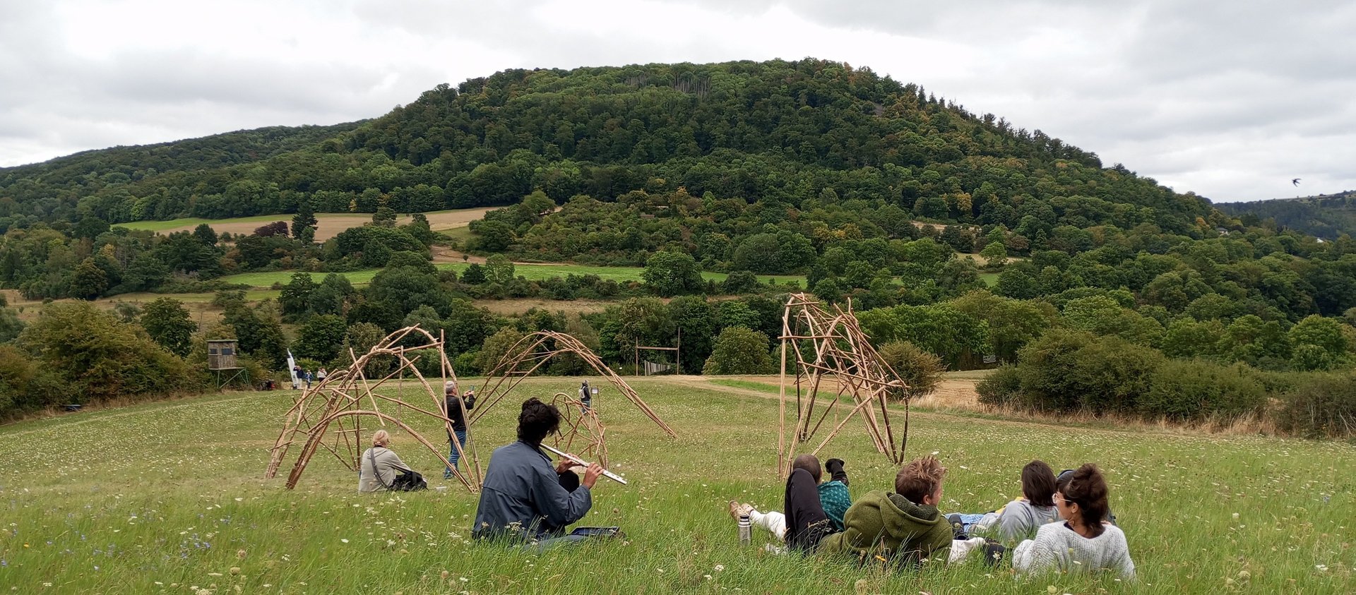 Het windkunstfestival vond plaats in Zierenberg. Een pittoresk dorp in centraal Duitsland, gelegen in een idyllische vallei omgeven door heuvels en bos. De heuvel waarop we onze bamboetempel zouden bouwen was magnifiek. Een glooiende bloemenweide die baadt in de zon, een oude wilg die schaduw biedt, een vulkanische heuvel van waarachter de maan ‘s avonds haar opwachting maakt en beneden in het dal Zierenberg, gezapig en tijdloos, gedomineerd door zijn robuuste kerktoren. Deze heuvel werd ons heiligdom. Hier zouden we onze tempel bouwen terwijl we onze huid lieten bruin branden door de zon. Hier zouden onze zielen elkaar raken.